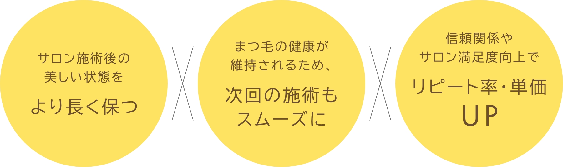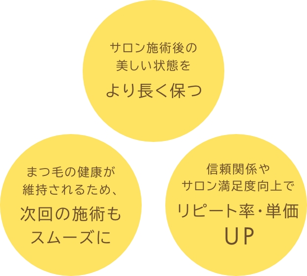 Miss eye d'orを使ったホームケアのおすすめには多くのメリットがあります。まず、サロン施術後の美しい状態をより長く保つことができ、まつ毛の健康が維持されるため、次回の施術もスムーズに行えるようになります。 さらに、具体的な使用タイミングやアドバイスをお客様にお伝えすることで、彼らとの信頼関係を築き、満足度を向上させることが可能で、リピート率や単価のアップも見込めるでしょう。